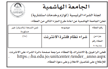 • إبحث في أكبر وأشمل قاعدة بيانات على مستوى الأردن, تحتوي على جميع العطاءات والمناقصات الحكومية، الدولية، الخاصة، والعسكرية مصنفة ومبوبة منذ عام 2013 حتى تاريخ اليوم!